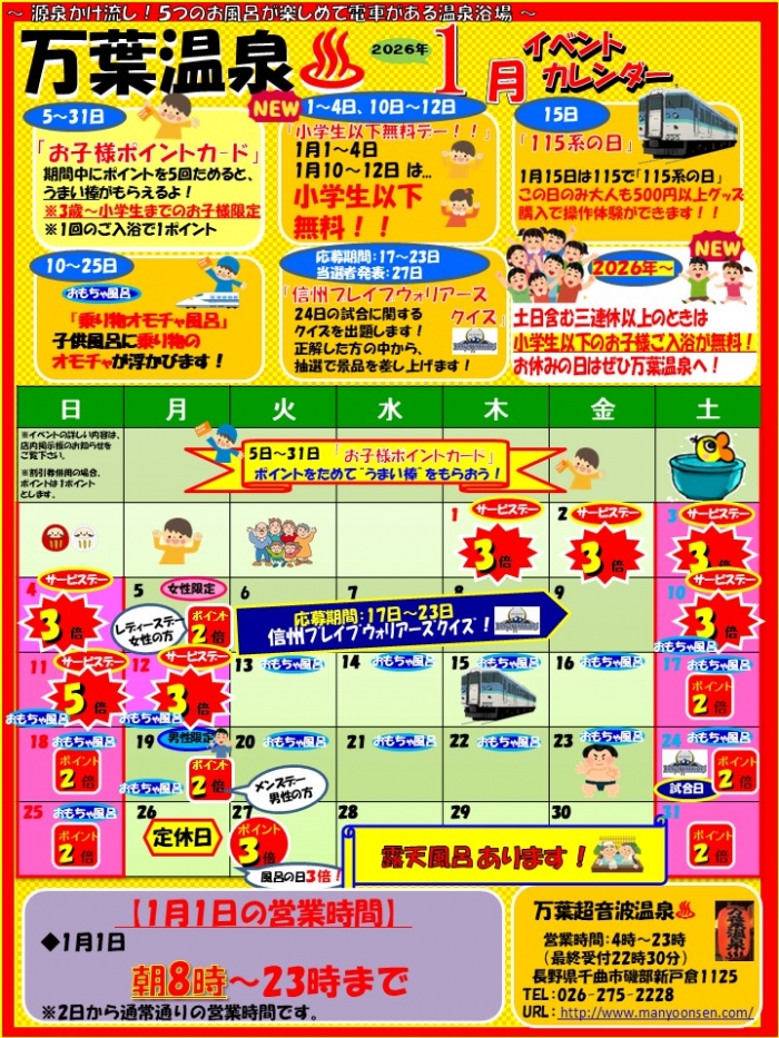 万葉超音波温泉♨️1月のイベントカレンダーです‼️