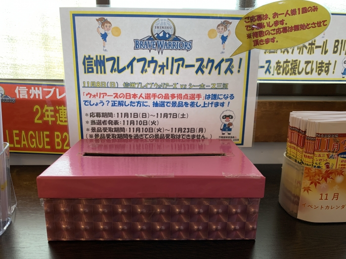 11月も『信州ブレイブウォリアーズクイズ』を開催します!8日(日)の対シーホース三河戦での「日本人選手最多得点選手」を予想してください!投票用紙はロビーに設置中です!正解多数の場合は抽選で"ウォリアーズホームゲームチケット等の賞品"を差し上げます!