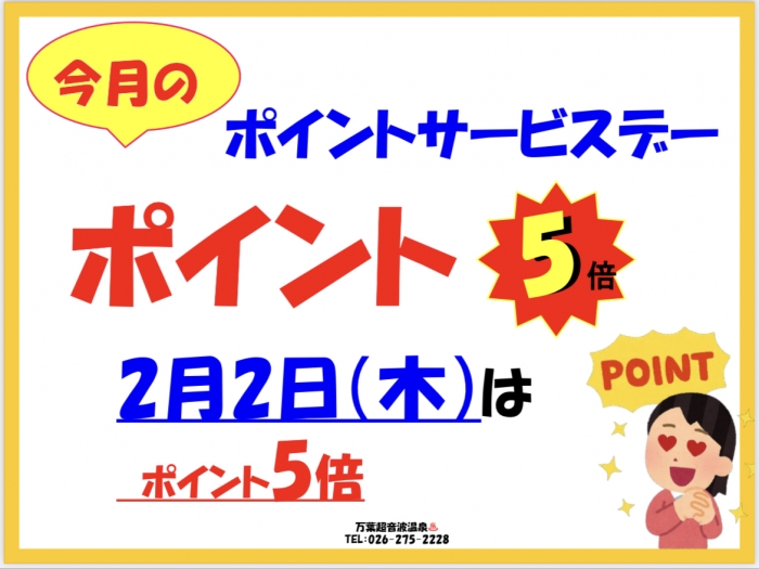 万葉超音波温泉♨️の2月2日(木)は『ポイント倍増・5倍デー』です❗️ポイントカードに5個のポイントを押します❗️皆様、お誘い合わせてのご来場をお待ちいたします‼️