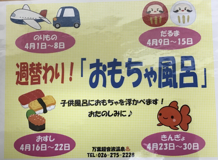 週替り「おもちゃ風呂」第一弾『乗り物』です‼︎ 《4月1日〜8日》