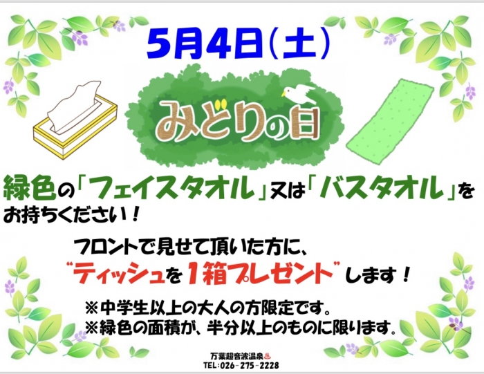 4日の万葉超音波温泉♨️は『みどりの日』イベントを開催します!緑色の「フェイスタオル」又は「バスタオル」をご持参のお客様に"ティッシュを1箱"プレゼントします!