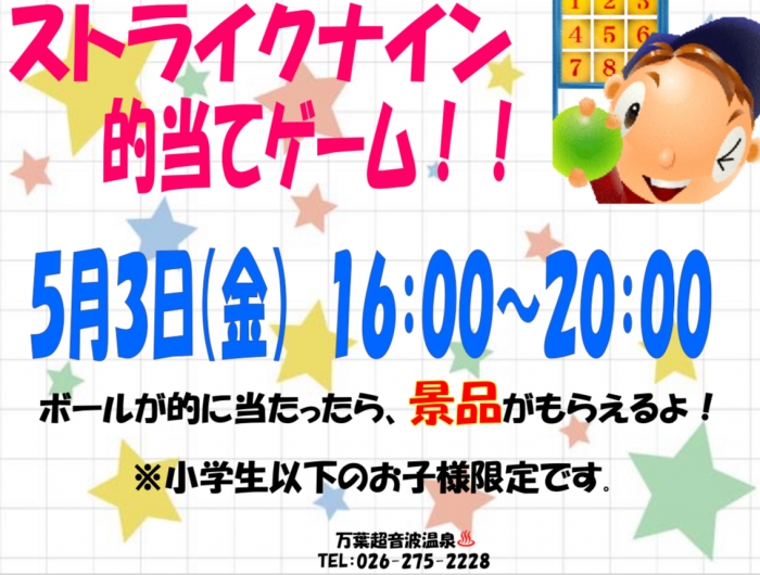 5月3日(祝)の万葉超音波温泉は『ストライクナイン的当てゲーム』開催です!(16時〜20時)ささやかですが景品を用意しています!ご参加をお待ちしています♪