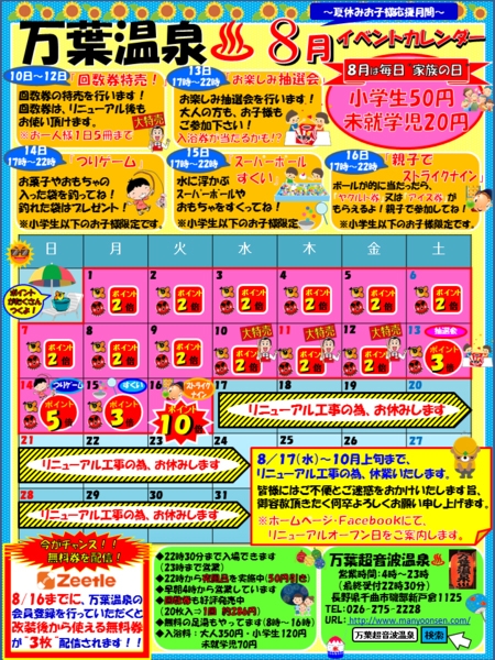 万葉温泉8月イベントカレンダーが出来上がりました!