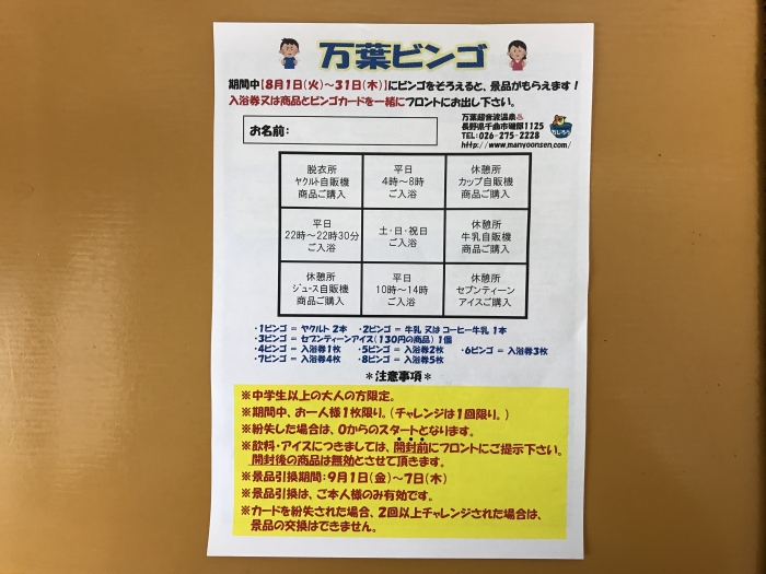 ●3ビンゴ → アイス ●4ビンゴ → 入浴券1枚