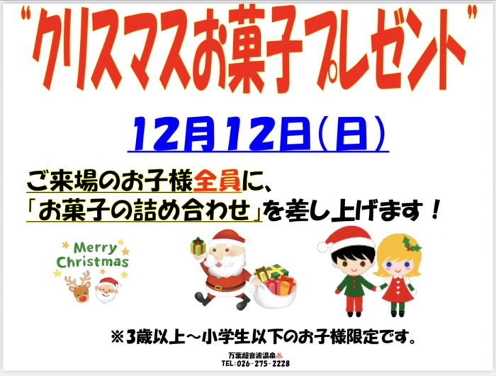 いつも万葉超音波温泉をご利用頂きまして誠にありがとうございます♨️ 12日(日)は『クリスマスお菓子プレゼント』開催です!ご来場のお子様に「お菓子の詰め合わせ」をプレゼントします!皆様のお越しをお待ちしております!