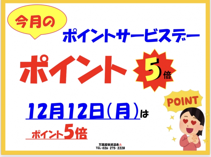 万葉超音波温泉♨️の12月12日(月)は『ポイント倍増デー・5倍』です❗️ポイントカードに5個のポイントを押します❗️お誘い合わせてのご来場をお待ちいたします‼️