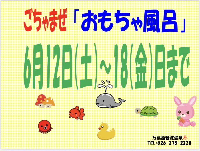 万葉超音波温泉では6月12日(土)から18日(金)まで『ごちゃまぜ!おもちゃ風呂』開催中です♨️ "子ども風呂"に色々なおもちゃが浮いています!ご家族皆様でのご来場をお待ちしております!