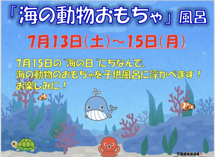 13(土)〜15日(祝)は『海の日』にちなんで 子供風呂に"海の動物のおもちゃ"をたくさん浮かべています!お楽しみ下さい!