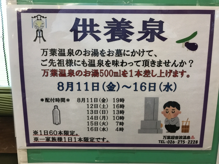お盆は「供養泉」を開催します、お墓に万葉温泉のお湯を!