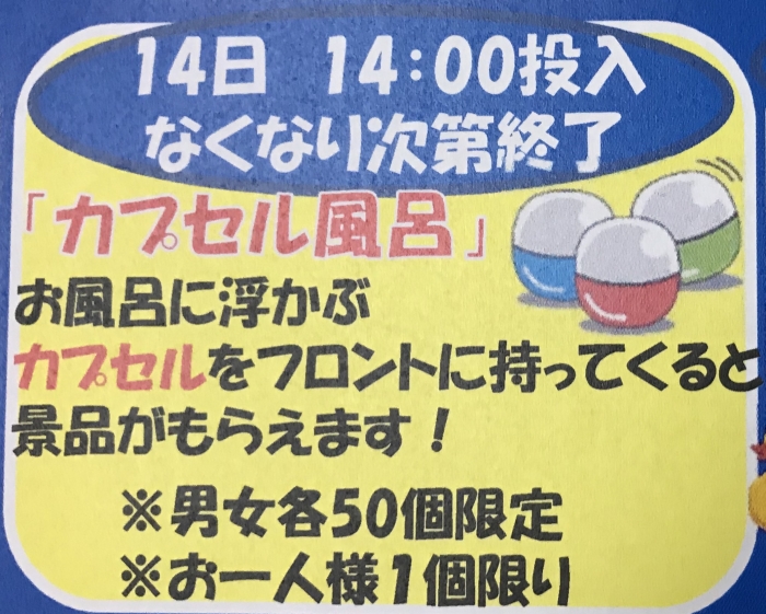 14日は午後2時から「カプセル風呂」を開催します!カプセルをフロントにお持ちください!