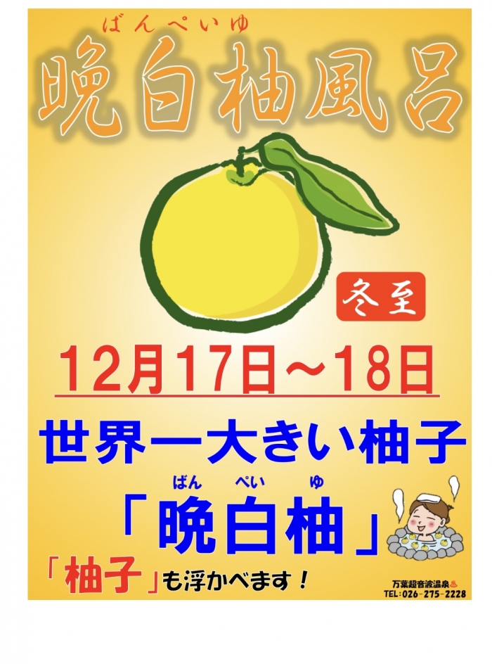 万葉超音波温泉♨️では12月17日(土)18日(日)に冬至恒例の『晩白柚風呂』を開催いたします‼️柚子も一緒に浮かびます‼️ご来場をスタッフ一同お待ちしております。