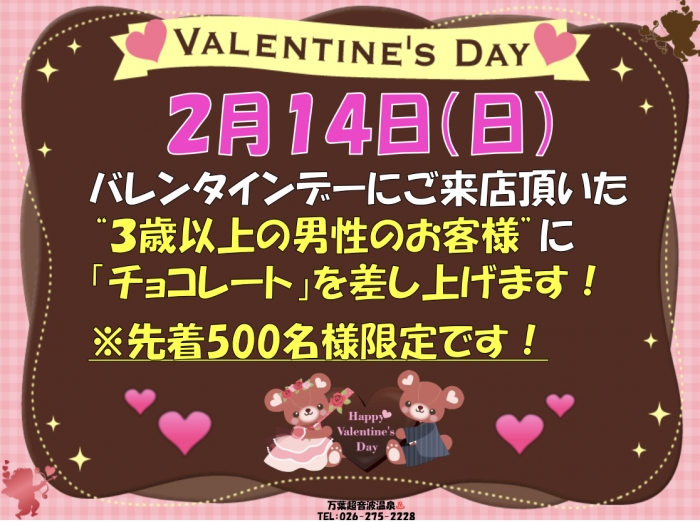 2月14日(日)の万葉超音波温泉『バレンタインデープレゼント』イベント開催です‼️ 日頃のご愛顧に感謝して先着500名の男性のお客様(3歳以上)に細やかですがチョコレートをプレゼントしています❗️ご家族皆様でのご来場をお待ちしています‼️
