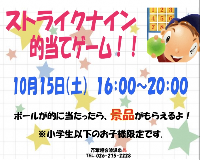 10月15日(土)の万葉超音波温泉は『ストライクナイン的当てゲーム』開催です!(16時〜20時)ささやかですが景品を用意しています!ご参加をお待ちしています♪