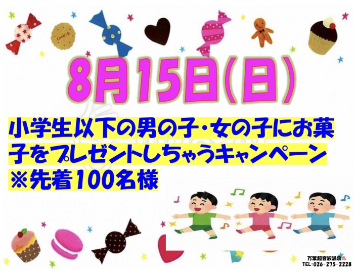 8月15日(日)の万葉超音波温泉は『お菓子プレゼントキャンペーン』です❗️ 「お菓子の詰め合わせ」を先着100名の小学生以下のお子様に差し上げます‼️皆様でのご来場をお待ちしています♨️