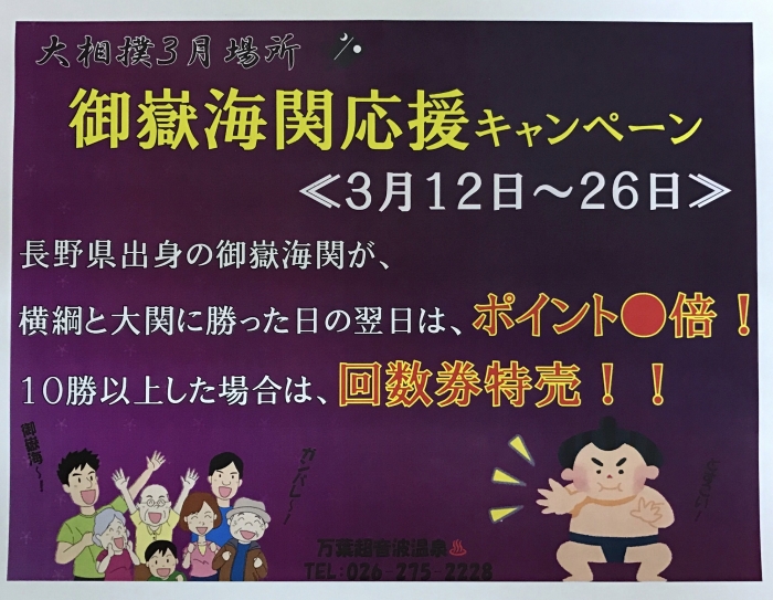 大相撲3月場所が開催中です。 長野県出身の『御嶽海関応援キャンペーン』開催中です!
