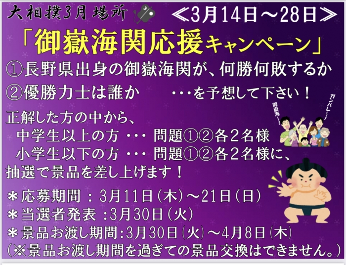 大相撲3月場所が始まりました‼️万葉超音波温泉♨️では恒例の『御嶽海関応援キャンペーン』開催中です‼️是非ご参加ください❗️正解されたお客様には抽選でささやかですが賞品をプレゼントいたします‼️