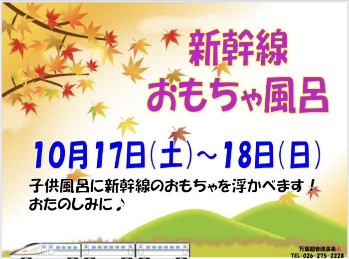 10月17日(土)18日(日)は『新幹線おもちゃ風呂』♨️を開催しています❗️男女子供風呂に200個の新幹線が浮かびます❗️ご家族お揃いでのご来場をお待ちしております‼️