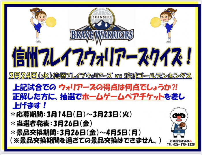 万葉超音波温泉♨️3月の『信州ブレイブウォリアーズクイズ』は24日の琉球ゴールデンキングス戦でのウォリアーズの得点を予想してください❗️正解したお客様に抽選で「ウォリアーズホームゲームペアチケット」を差し上げます!ご応募をお待ちしております!