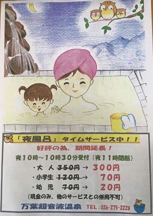 万葉温泉のお得な『夜風呂タイムサービス』をご存知でしょうか? 夜10時から最終受付の10時30分までにお入り頂きますと、