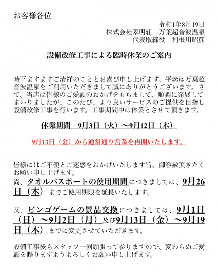 【設備工事による臨時休業のご案内】