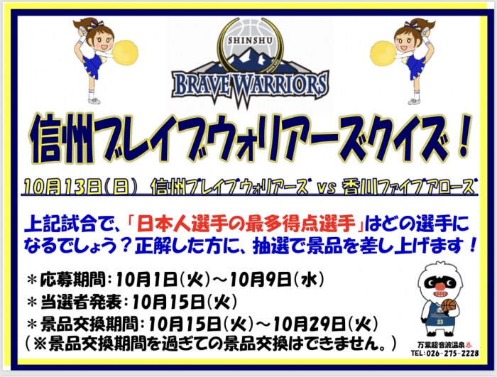 万葉超音波温泉『第1回信州ブレイブウォリアーズクイズ』開催中です❗️13日(日)のホームことぶきアリーナでの香川戦での"日本人最高得点選手は誰⁇"9日(水)まで投票できます!皆様のご参加をお待ちしております❗️