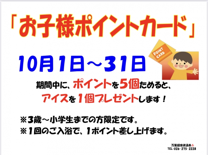 10月中に5回ご来場のお子様に"アイス"をもれなくプレゼントします❗️月内何度でもチャレンジ可能です❗️「お子様ポイントカードは万葉温泉♨️ロビーに設置しました。