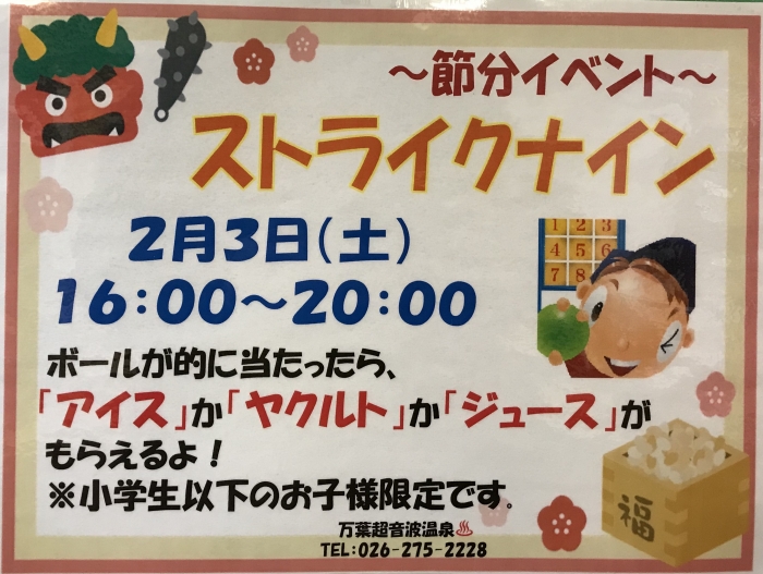 3日(土)は 節分イベント「鬼退治ストライクナイン」を開催します。アイスやヤクルトをゲットしちゃいましょう!時間は16時〜20時までです。