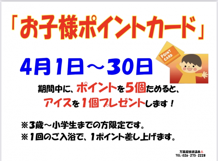 『お子様ポイントカード』を開催中です‼️4月中に5回ご来場のお子様に"アイス"をもれなくプレゼントします❗️月内何度でもチャレンジ可能です❗️「お子様ポイントカードは万葉温泉♨️ロビーに設置しました。