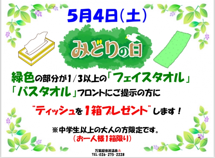 5月4日(土)は「みどりの日」です!万葉超音波温泉では 緑の部分が1/3以上な『フェイスタオル又はバスタオル』ご持参のお客様に【ティッシュ 1箱】をプレゼントします!フロントに提示してください! ※中学生以上の大人の方が対象です!