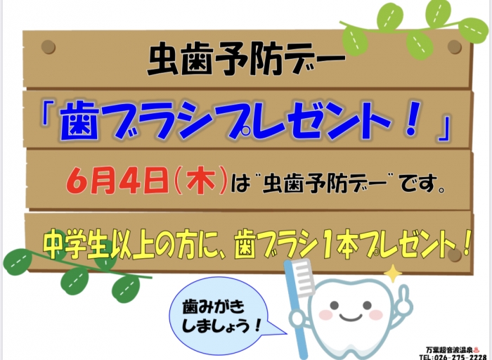6月4日は『虫歯予防デー』です!万葉超音波温泉♨️では"歯ブラシプレゼント"を行います‼️