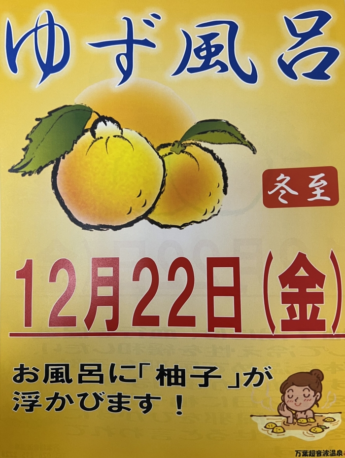 12月22日(金)は冬至❗️万葉超音波温泉では恒例の『ゆず風呂』を開催いたします‼️お誘い合わせてのご来場をスタッフ一同お待ち申し上げます♨️