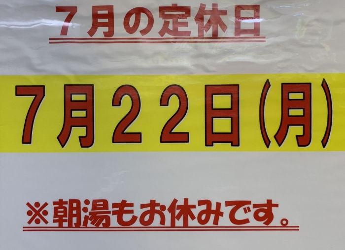 平素は万葉超音波温泉をご利用いただきまして誠にありがとうございます。22日(月)は月一回の定休日です。温泉設備の改修・点検等に当てています。お客様にはご不便とご迷惑をお掛けいたしますが何とぞよろしくお願い申し上げます。