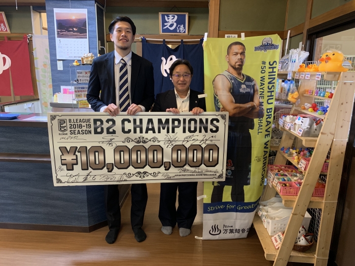 21日、信州ブレイブウォリアーズの#26 上杉翔選手が2018-19シーズンB2リーグ優勝の報告に万葉超音波温泉へ来てくれました。優勝おめでとうございます!来季は二連覇、そしてB1昇格に向けてのシーズンになります‼️チームの益々の飛躍を期待しています❗️上杉翔選手は先日、自由交渉契約リストに公示されました。他チームへの移籍となると寂しくなりますが更なるご活躍をお祈りいたします!