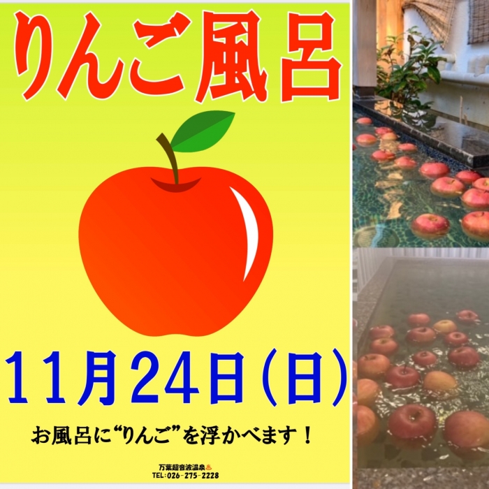 万葉超音波温泉の11月24日(日)は毎年恒例の『りんご風呂』を開催します❗️合計300個のりんごが男女浴槽に浮かびます❗️お誘い合わせてのご来場をスタッフ一同お待ちしております❗️(画像は昨年のりんご風呂です)