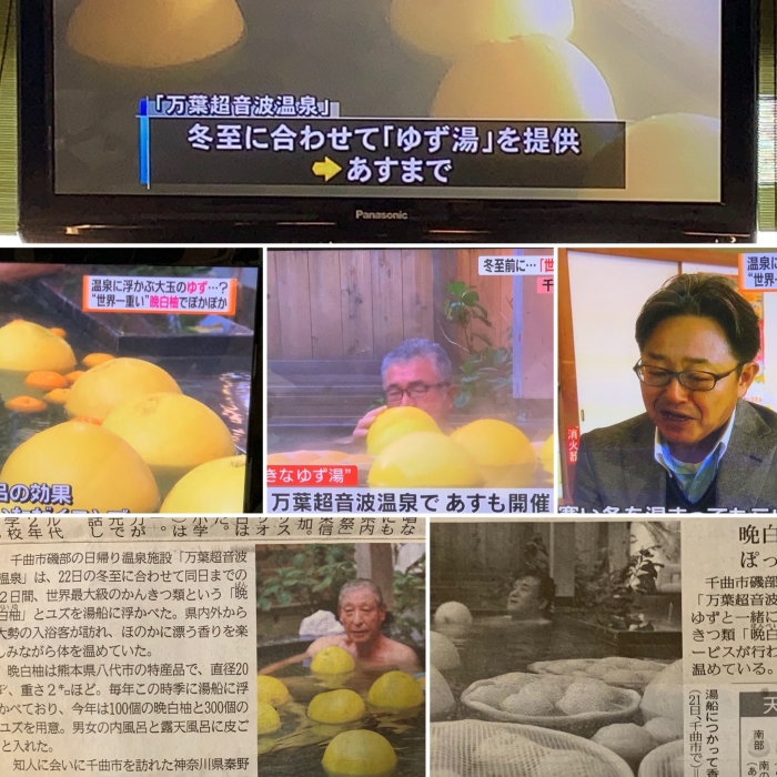 いつも万葉超音波温泉にご来場誠にありがとうございます。2日間開催した万葉超音波温泉『晩白柚風呂』は長野県テレビ局3社の21日夕方のニュースと新聞社2社で取り上げてもらいました!
