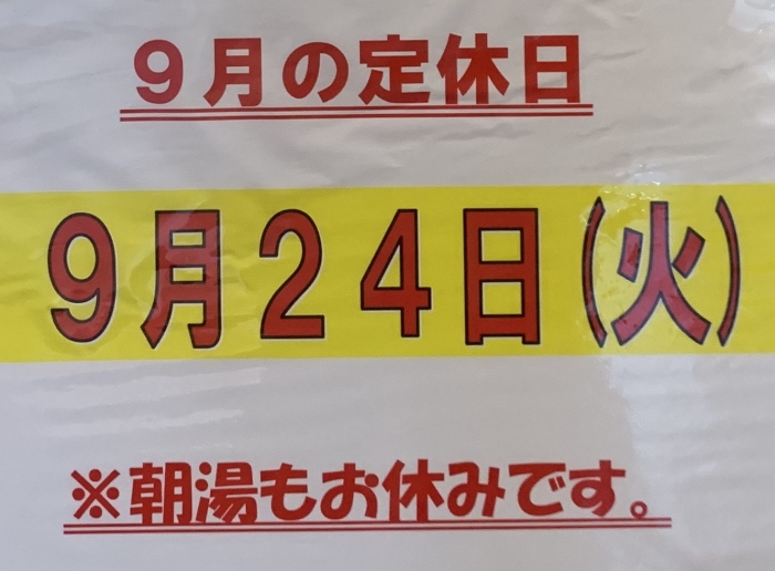 平素は万葉超音波温泉をご利用いただきまして誠にありがとうございます。24日(火)は定休日です。温泉設備の改修・点検等に当てています。お客様にはご不便とご迷惑をお掛けいたしますが何とぞよろしくお願い申し上げます。