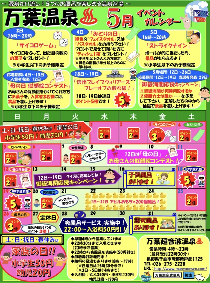 年号が令和に変わり最初のイベントカレンダーです❗️ ゴールデンウィーク後半に始まり5月も盛りだくさんの楽しいイベント満載です‼️もちろん、いつもの源泉かけ流し天然温泉で皆様のご来場をお待ちしております!令和の新時代も万葉超音波温泉をよろしくお願い申し上げます。