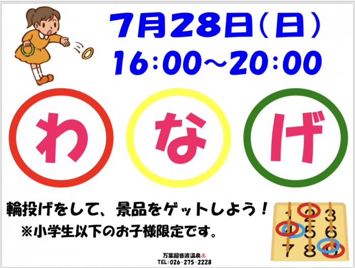 28日(日)の万葉温泉は、お子様特別イベント『わなげ』ゲームを16時〜20時まで開催します!賞品をゲットしましょう!お楽しみください。皆様のご来場をお待ちしております❗️