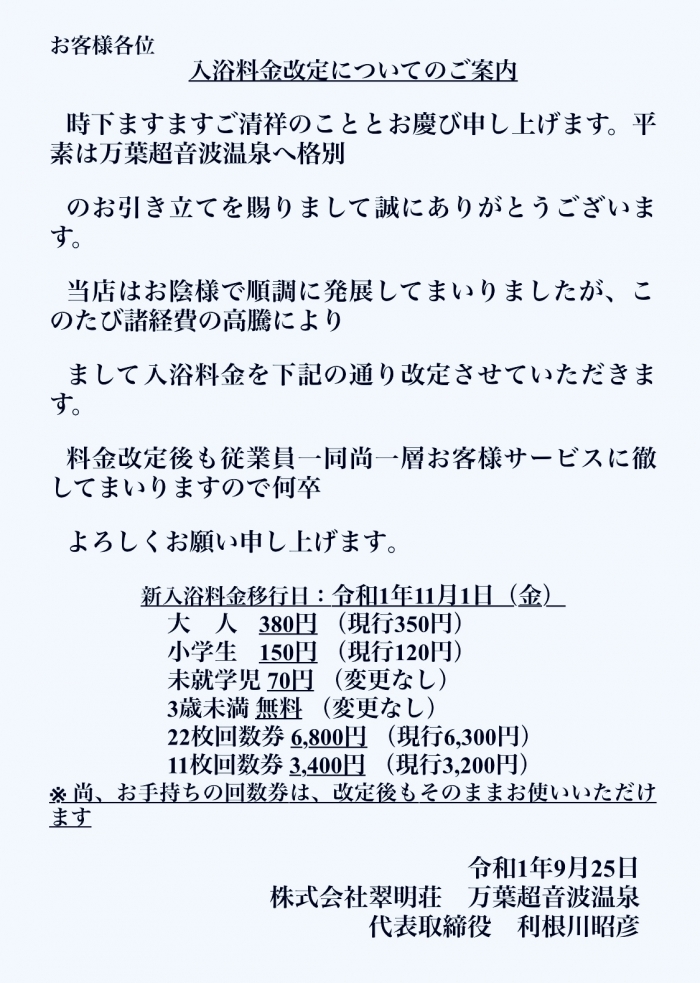 毎度、万葉超音波温泉をご利用頂きまして誠にありがとうございます。令和1年11月1日から入浴料金を改定させて頂きます。何卒よろしくお願い申し上げます。