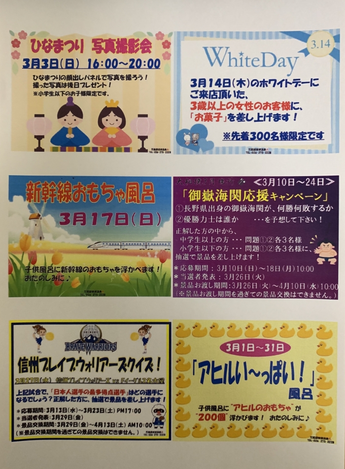 3月も盛り沢山です!ご来場をお待ちしております。万葉温泉で温かくお過ごし下さい♨️