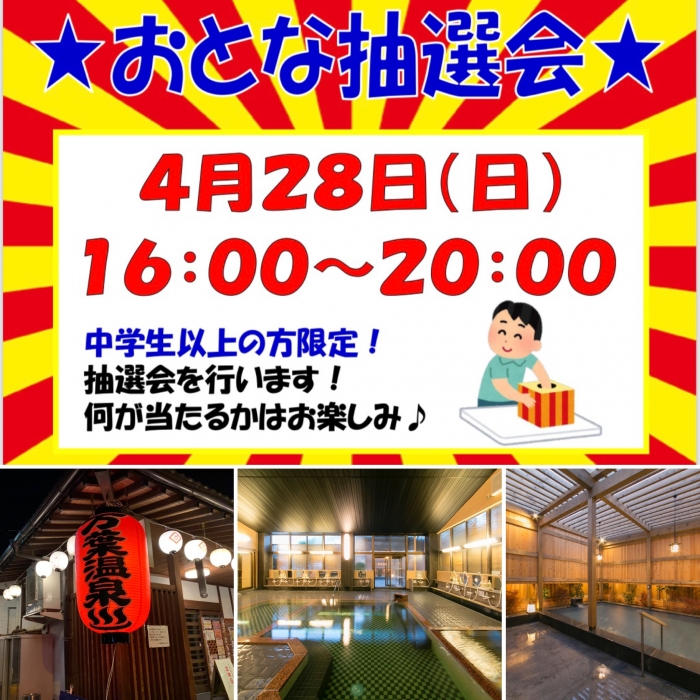 28日(日)の万葉超音波温泉♨️は午後4時〜20時まで中学生以上の大人のお客様限定GWイベント 『おとな抽選会』を開催いたします‼️ お誘い合わせのご来場をお待ちしております!