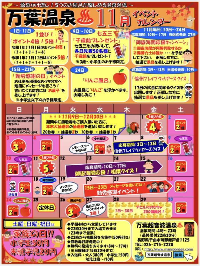 万葉超音波温泉11 月のイベントカレンダーが出来上がりました❗️11 月も楽しく、盛り沢山のイベントをお楽しみください。又お得な情報が満載です‼️