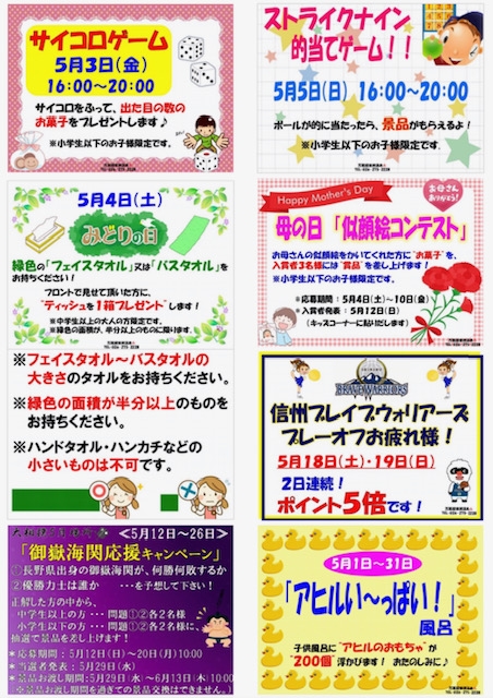 5月の万葉超音波温泉♨️も 18日・19日の『信州ブレイブウォリアーズ プレイオフお疲れ様5倍デー』はじめお客様にお楽しみいただけますイベント満載です❗️令和の新時代も万葉温泉♨️をよろしくお願い申し上げます