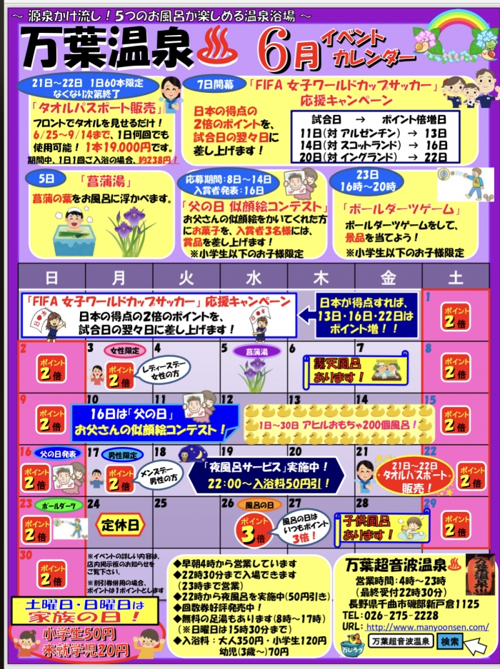 万葉超音波温泉♨️ 6月のイベントカレンダーです。 6月も楽しいイベントとお得な情報が満載です‼️ 万葉温泉ロビーに設置・掲示しました!よろしくお願い申し上げます。