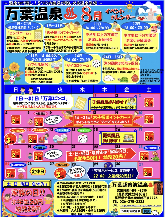 万葉超音波温泉♨️ 8月のイベントカレンダーが出来上がりました❗️