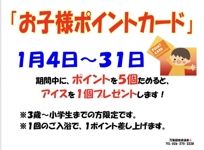 2021年万葉超音波温泉イベント第1弾は『お子様ポイントカード』です!5回のご来場でアイスをプレゼントします!1月中は何度でもチャレンジできます!