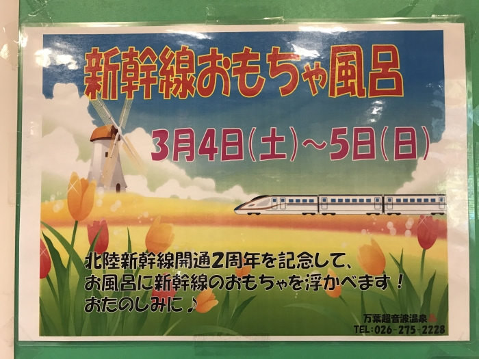 3月4日(土)5日(日)は北陸新幹線金沢延伸2周年を記念して「万葉温泉新幹線おもちゃ風呂」を開催します! お子様風呂にいつものアヒル達に加えて「新幹線のおもちゃ」がたくさん浮かびます。ご家族おそろいでのご来場をお待ちしております。