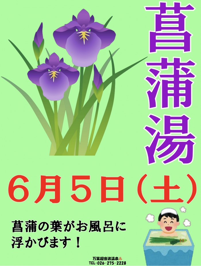 万葉超音波温泉では旧暦の端午の節句6月5日に恒例の『菖蒲湯』を開催します‼️邪気を払い暑い夏を丈夫に過ごすことが出来ると言われている伝統の風習です❗️ご来場をお待ちしております❗️