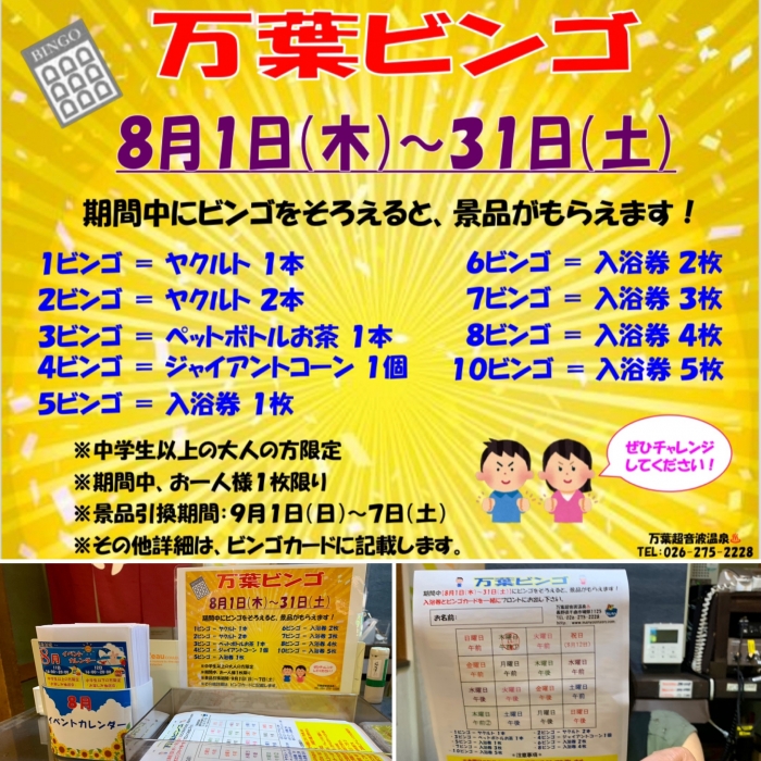 毎年8月恒例の『万葉ビンゴ』が始まりました♨️ 31日までの期間中、各曜日にご来場毎にスタンプを押します!最高10ビンゴで"入浴券を5枚"差し上げます‼️チャレンジしてみてください!