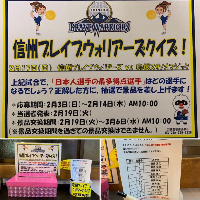 "信州ブレイブウォリアーズクイズ"が始まりました。対象試合は2月17日(日)の現在西地区2位 島根スサノオマジック戦です!この試合でのウォリアーズの『日本人選手最多得点選手は誰でしょうか』が問題です。2月14日am10:00が応募締切です。沢山のお客様のご参加をお待ちしています。応募用紙・投票箱は万葉温泉ロビーに設置致しました。